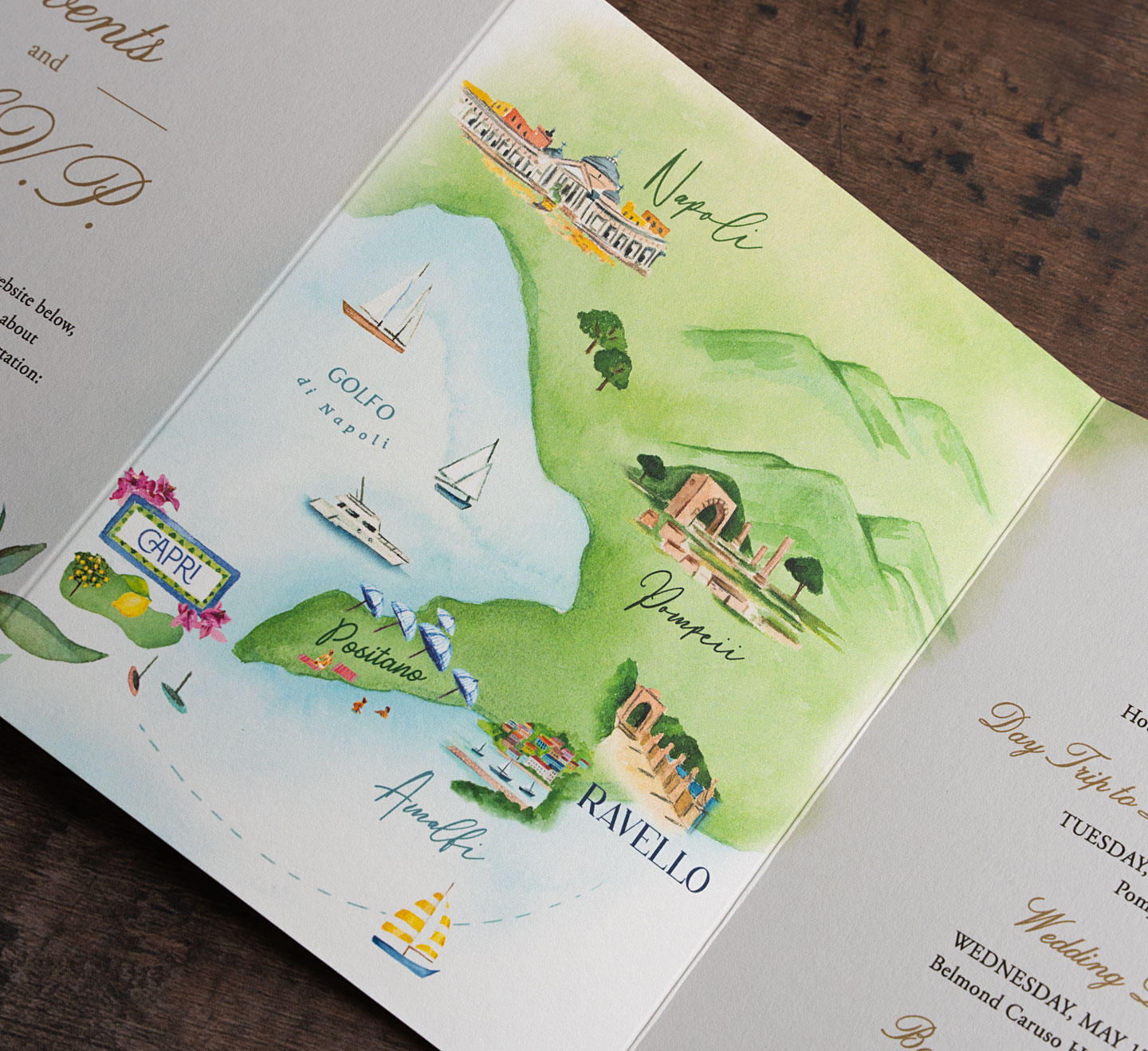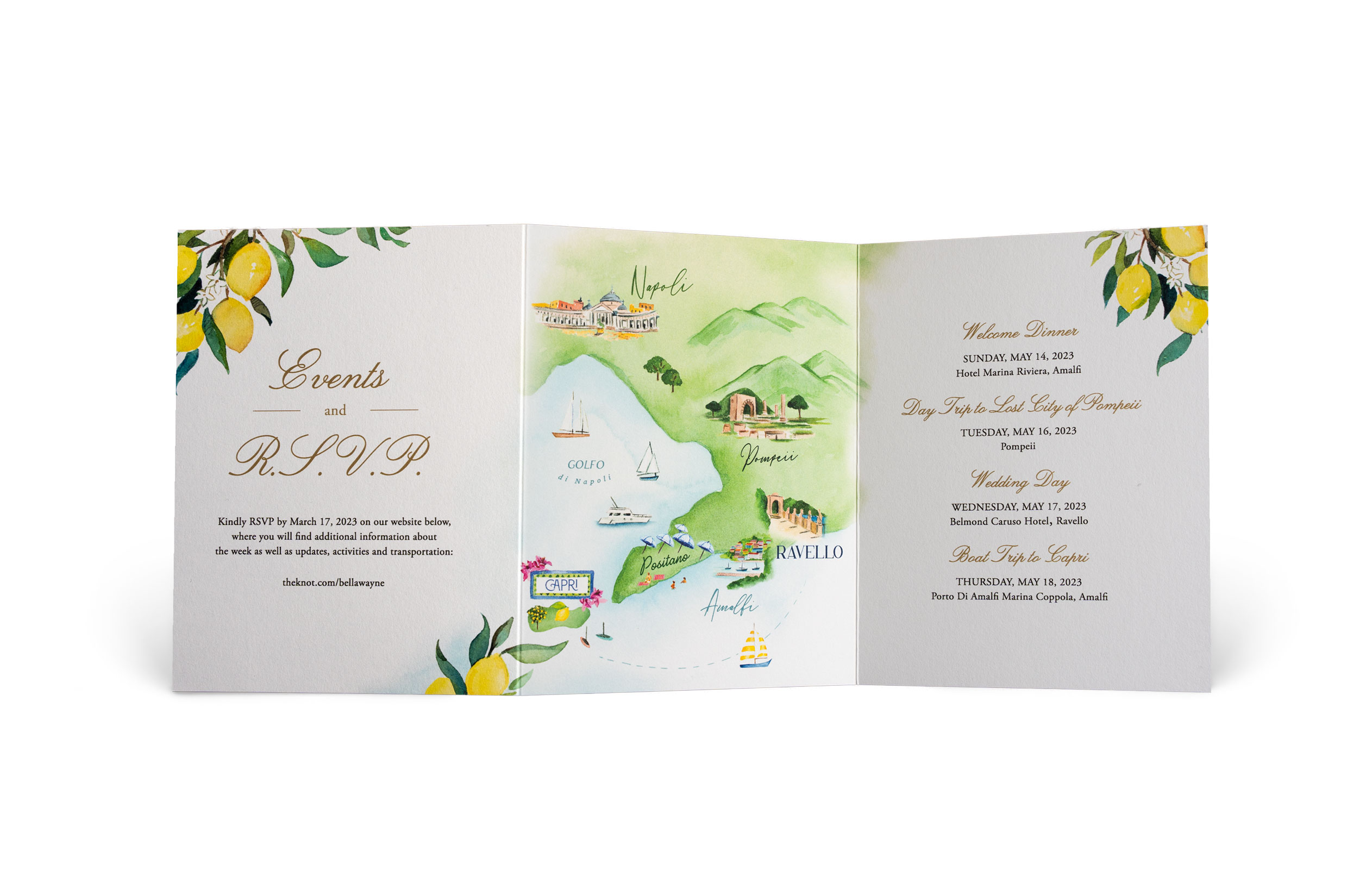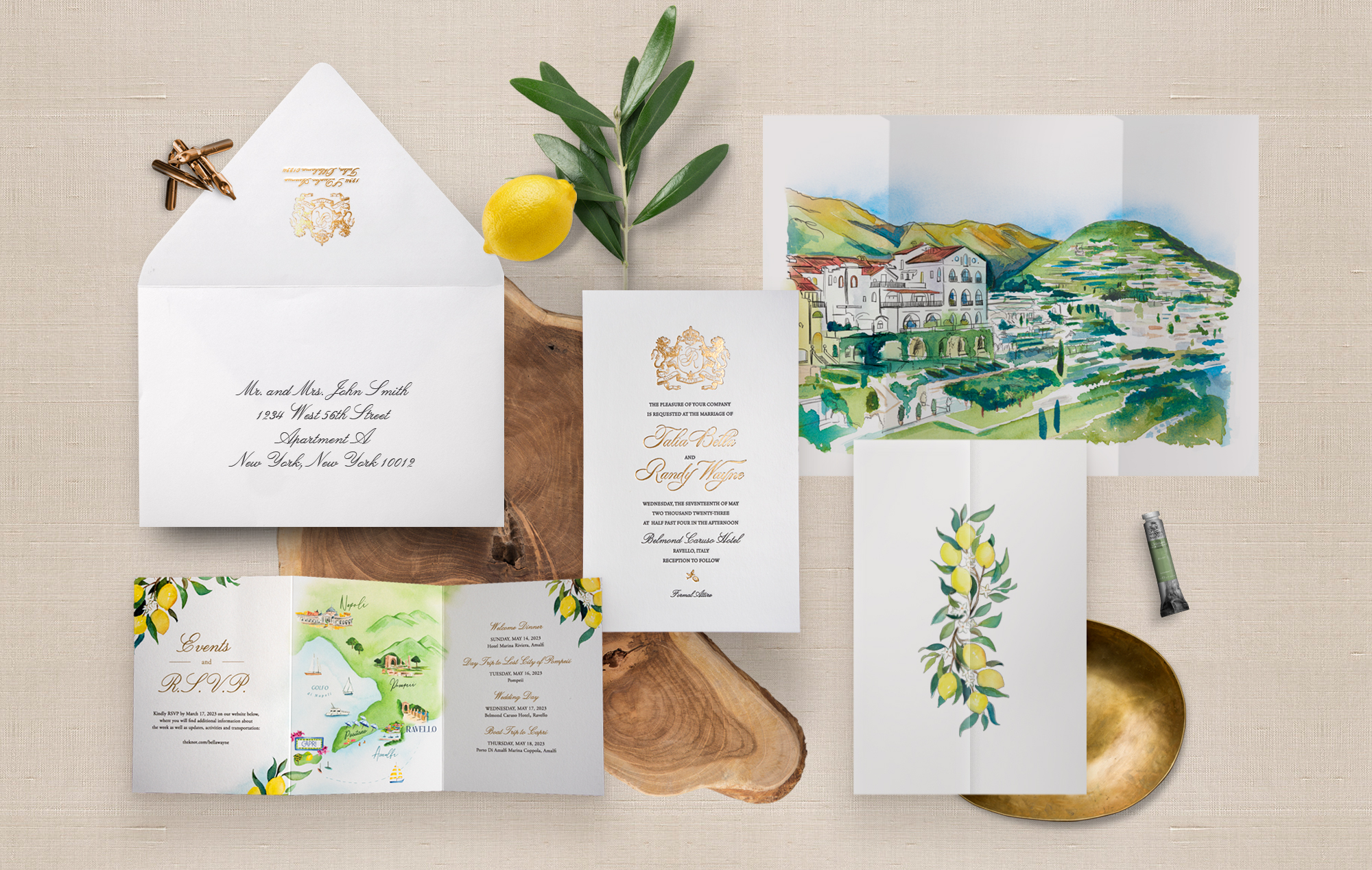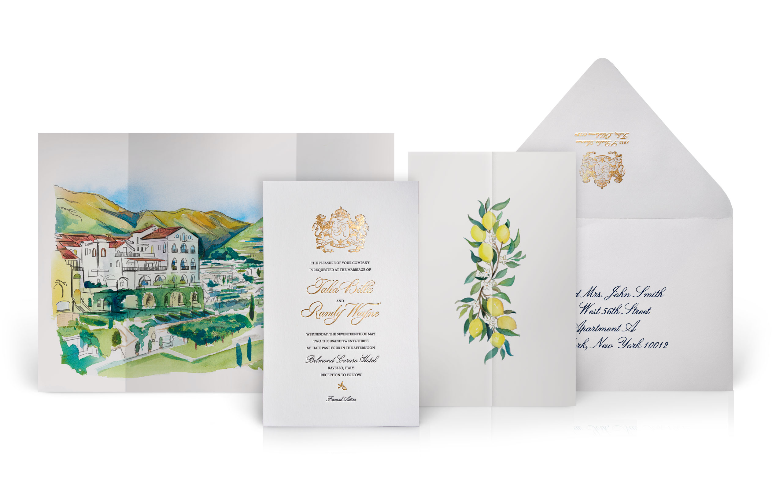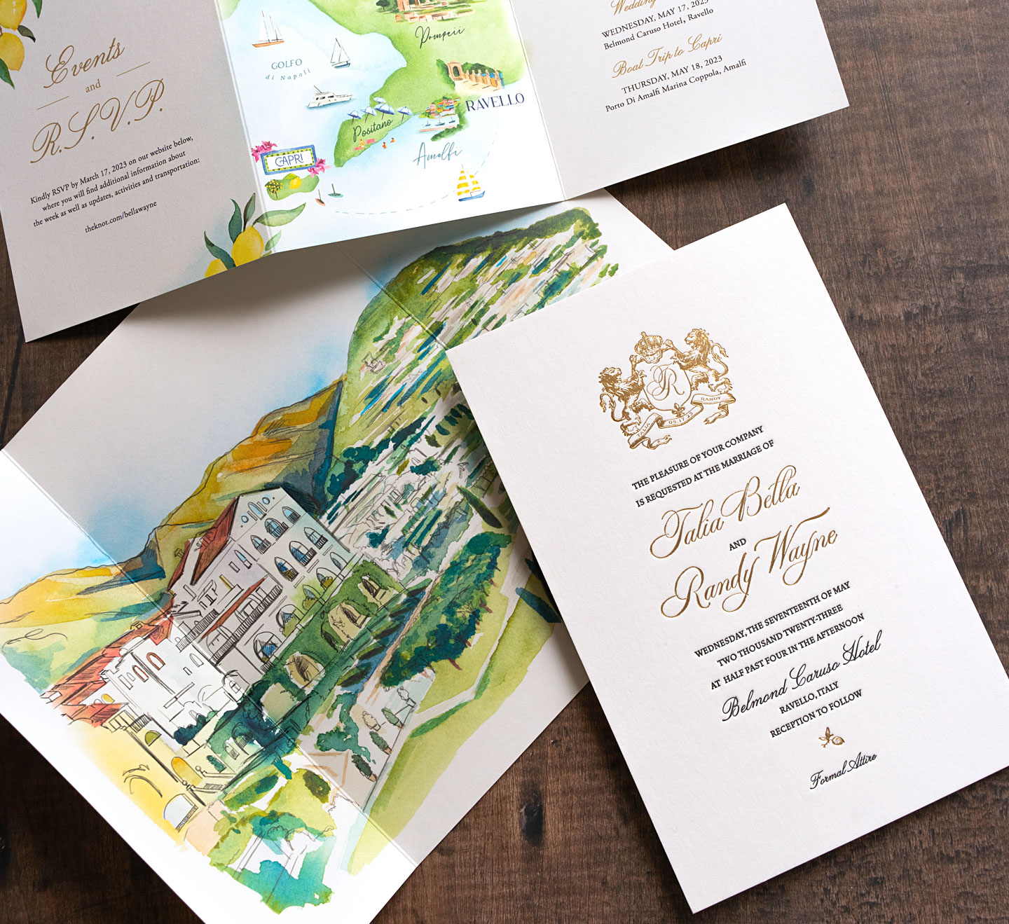 For a stunning wedding in Ravello, Italy, we designed a custom invitation suite that beautifully reflects the romance of the Amalfi Coast. The wrap is adorned with vibrant hand-painted lemons, celebrating the region’s iconic citrus. The invitation itself is elegantly printed in plush letterpress with shimmering gold foil, crowned with a regal lion coat of arms. Adding a personal touch, the suite features a hand-painted view of Ravello’s breathtaking coastline and a custom map highlighting nearby landmarks such as Naples, Pompeii, and the Isle of Capri. A timeless design for an unforgettable destination wedding.