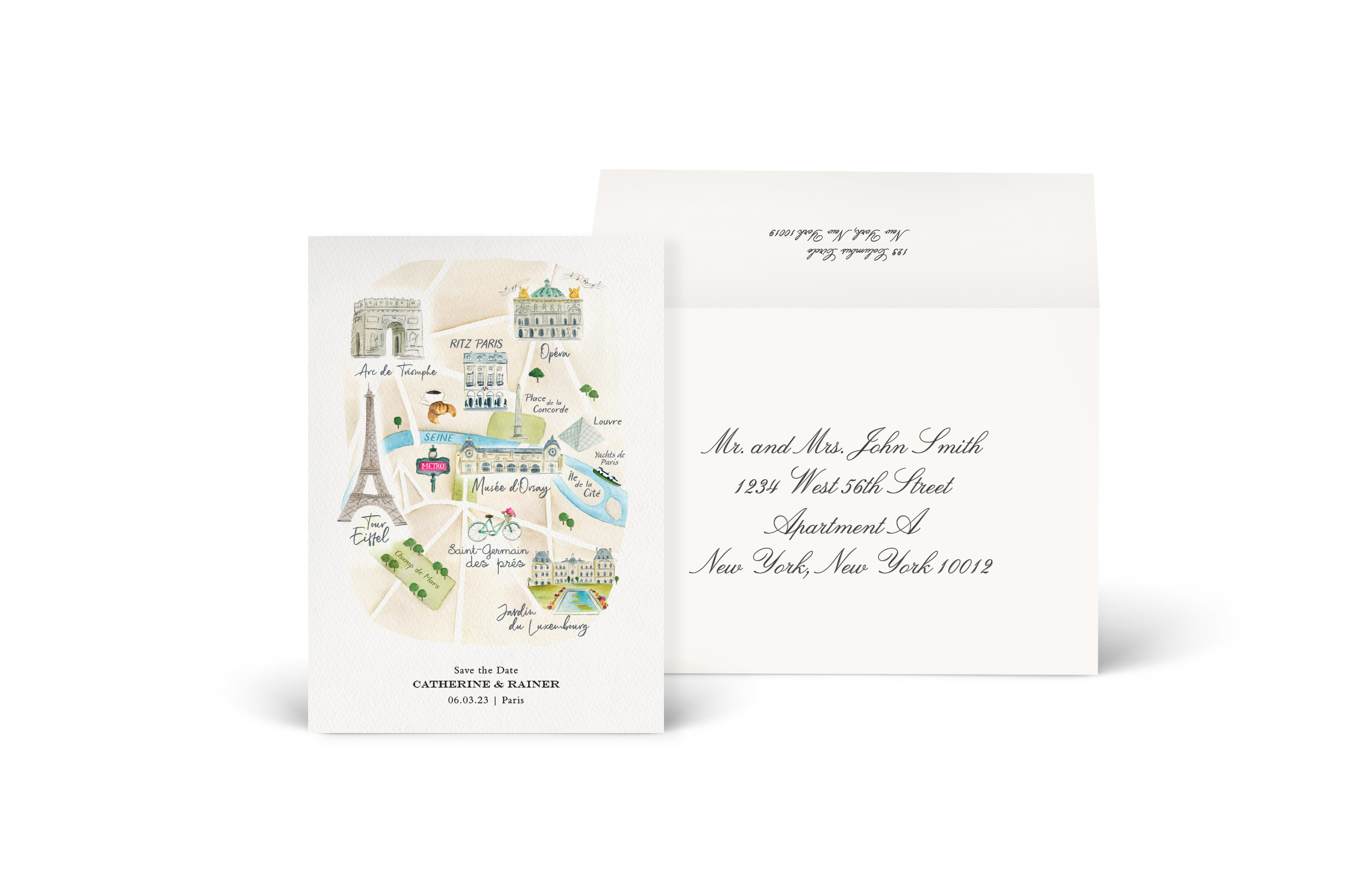This hand-painted Save the Date captures the enchanting spirit of Paris in soft watercolor washes and sketches. From the elegant halls of L’Opéra to the tree-lined paths of Jardin du Luxembourg, each detail brings the city to life—Saint-Germain-des-Prés, the iconic Ritz, and more—inviting guests on a romantic journey through the City of Light and setting the stage for a celebration as timeless and dreamy as Paris itself.