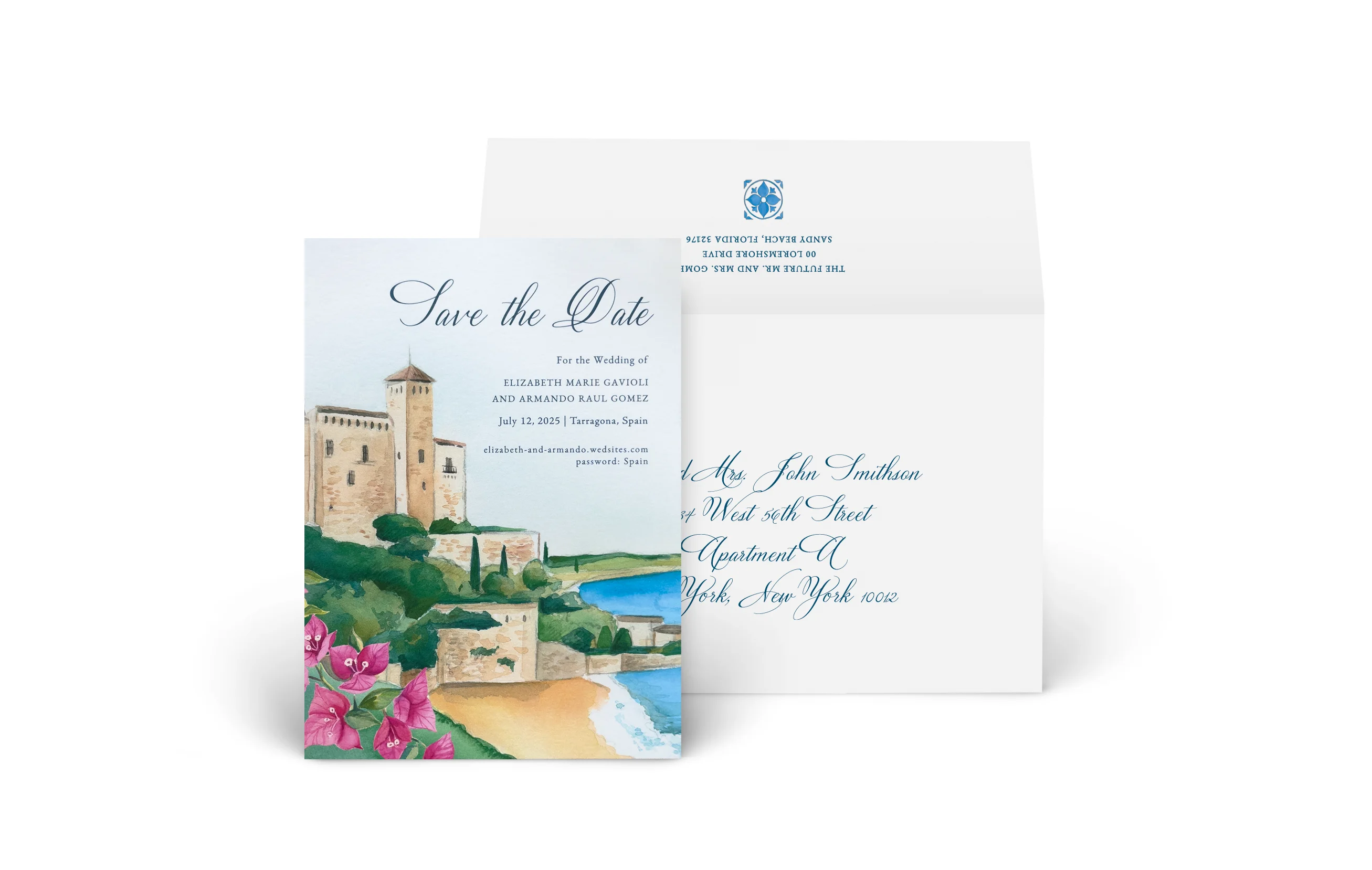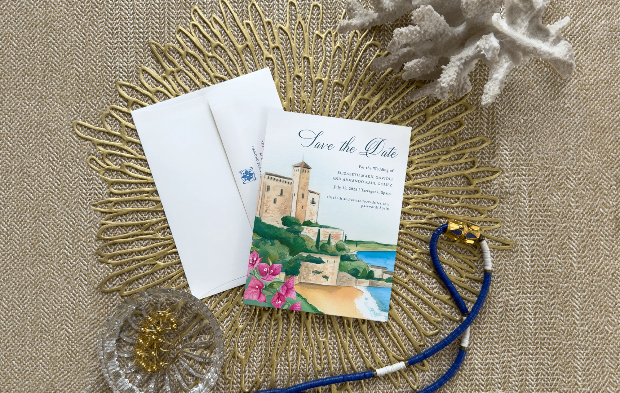 A destination revealed in watercolor—this save the date features a coastal castle in Tarragona, framed by bright bougainvillea and the Mediterranean beyond. The illustration is hand-painted and paired with clean, elegant typography that keeps the focus on the setting. Flat printed on eggshell paper, the soft, tactile finish complements the watercolor, giving the piece a quiet presence in hand.